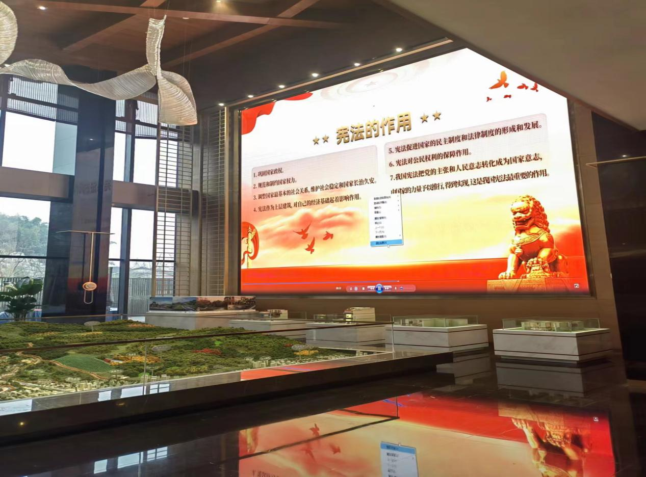 三是定點投放憲法宣傳標語。為加強憲法宣傳,提高公民的法律意識,同時起到時刻提醒公民關(guān)注憲法、了解憲法的作用,雅安文旅集團通過酒店大屏、建設(shè)工地、房產(chǎn)銷售中心等多處電子宣傳屏投放憲法宣傳標語,以此營造良好的憲法宣傳氛圍,增強了憲法學(xué)習(xí)宣傳聲勢,形成了規(guī)模效應(yīng)。